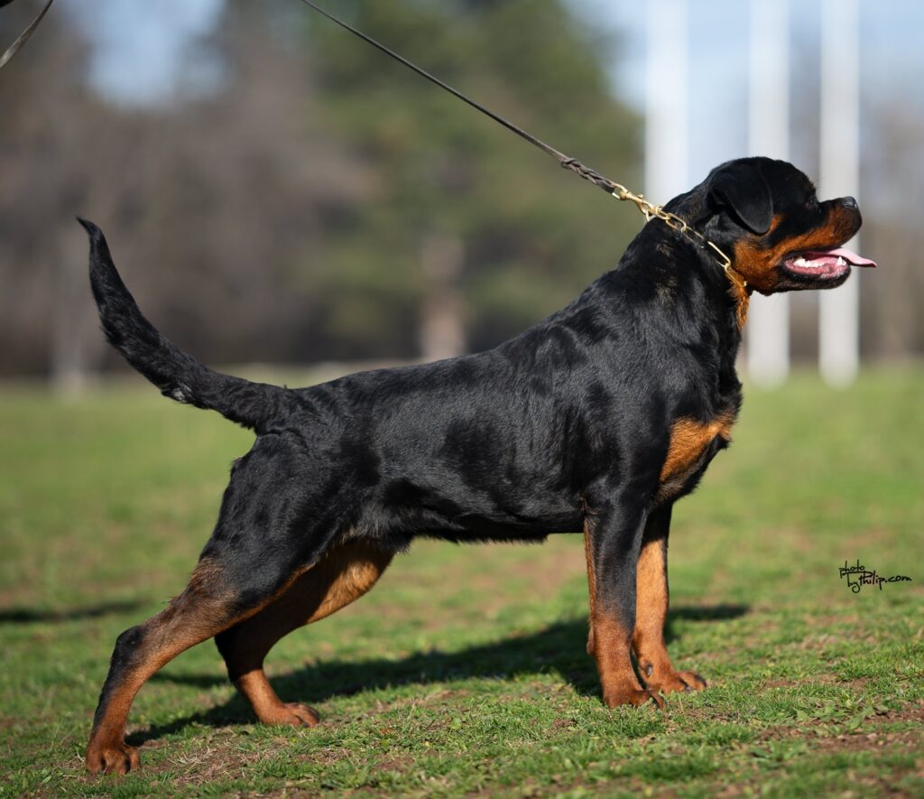 Dramatic effect doesn’t stop when Baikal stands still. Spirited and bold, Baikal belongs to our “hot-blooded” Rottweilers, bred for agility and speed.